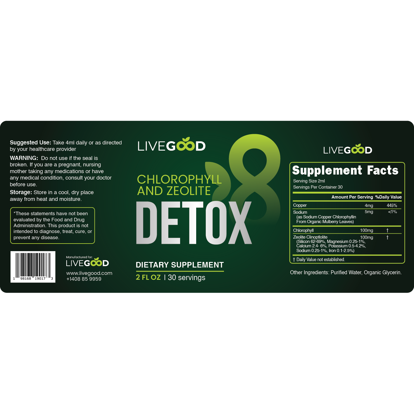 বিশুদ্ধ, প্রাকৃতিক উপাদান : ক্লোরোফিল, উদ্ভিদে পাওয়া একটি সবুজ রঙ্গক, রক্তকে ডিটক্সিফাই এবং বিশুদ্ধ করার ক্ষমতার জন্য পরিচিত। জিওলাইটের সাথে মিলিত, একটি প্রাকৃতিকভাবে উদ্ভূত খনিজ যা বিষাক্ত পদার্থকে আকর্ষণ করে এবং আটকে রাখে, এই জুটি একটি শক্তিশালী কিন্তু মৃদু ডিটক্স প্রদান করে।